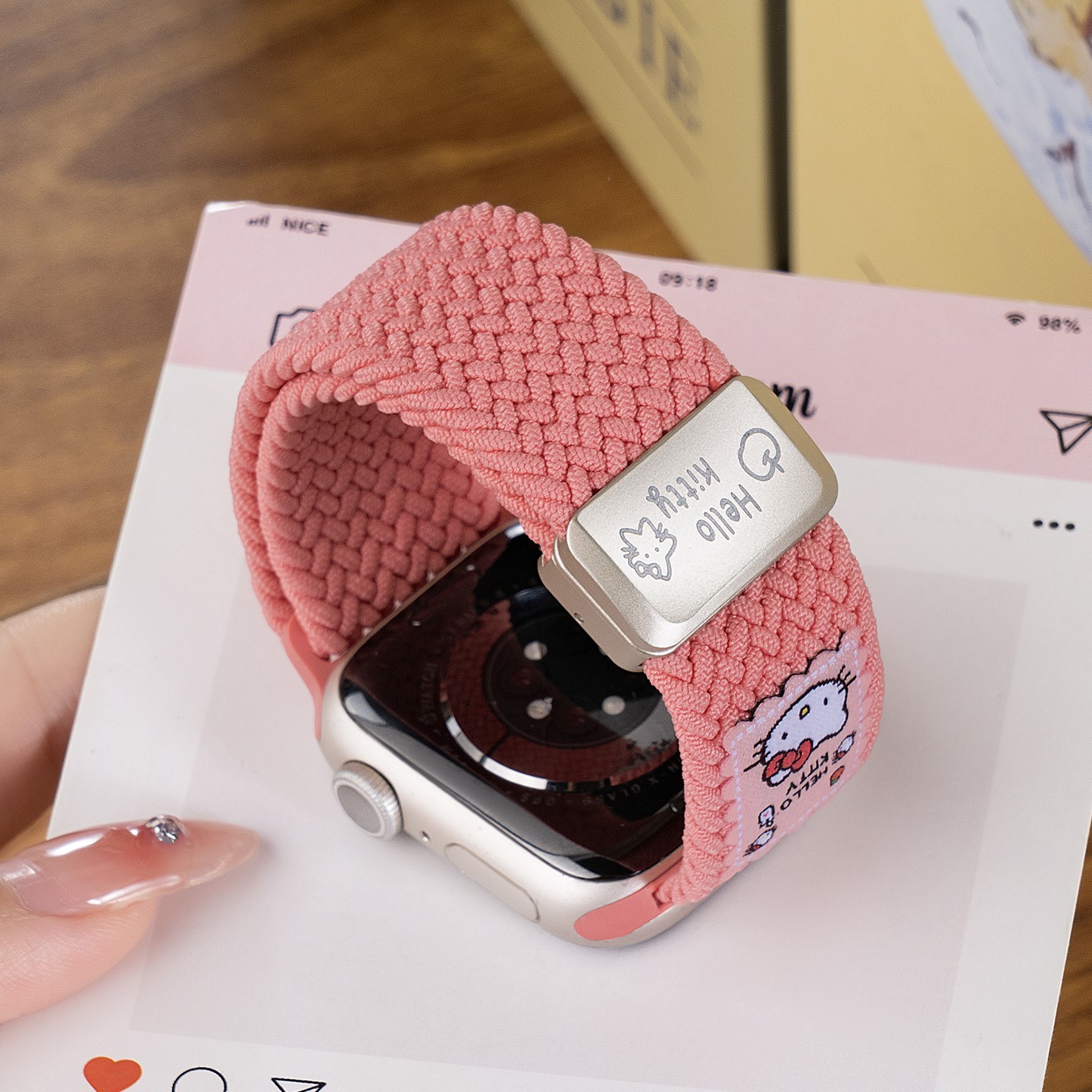 匠戴推出的这款适用苹果S11、iwatch10、applewatch9等多款手表的表带,专为女生设计,风格可爱又高级时尚。它采用编织工艺,是磁吸尼龙材质,非常适合夏天佩戴,运动时也十分适配。现在天猫商城有活动,表带尺寸为适用iwatch S10、颜色为kit猫的这款,参加立减5元活动,...