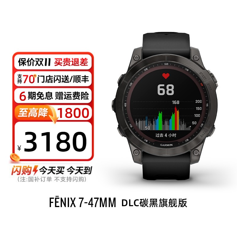GARMIN佳明Fenix7户外运动手表在天猫双11国补抢先购中迎来超值优惠,10月15日20:00活动正式开启,原价3180元,现参与国家补贴立减15%,最终到手价仅需2703元,省钱省心抢购正当时。这款高端户外运动手表专为极限探险与日常训练打造,融合强悍续航、多频多星定位、腕上导航及全面健康监测功能,支持上百种运动模式,无论是登山、越野、游泳还是骑行都能精准记录每一刻数据。高亮度显示屏在强光下依然清晰可见,坚固耐用的材质满足军规标准,是户外爱好者和专业运动员的理想之选。现在入手不仅享受真香价格,更可体验科技与性能的完美结合,错过再等一年。
