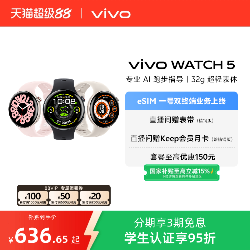 vivo WATCH5智能手表现正热卖中,集运动健康监测与智能生活助手于一身,支持全天候心率、血压监测,精准记录每一次运动数据,助你科学管理身体健康。搭载高清大屏与长续航设计,无论是日常通勤还是户外运动都能轻松应对。