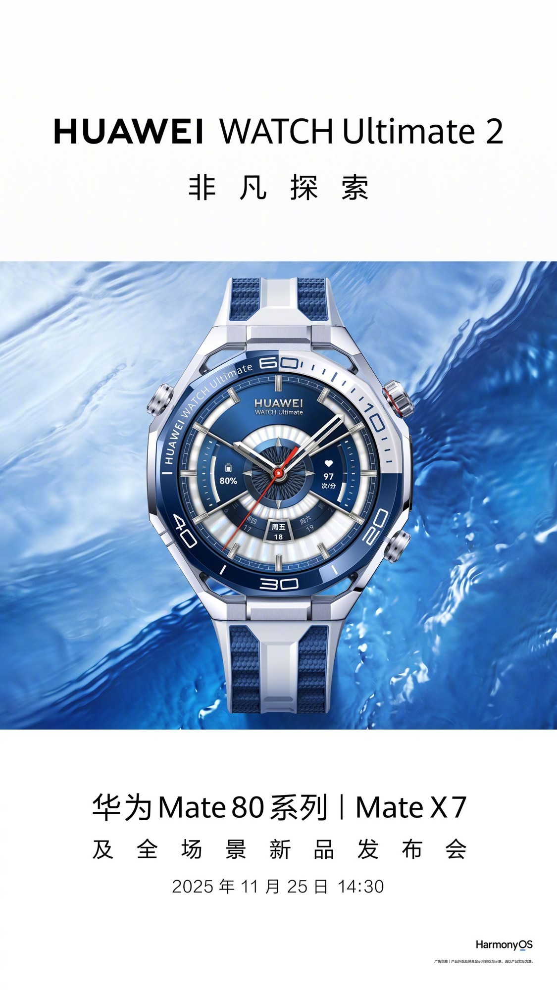 11月25日14时30分,华为将举办Mate 80系列、Mate X7及全场景新品发布会,届时将正式推出华为WATCH Ultimate 2非凡探索手表。该产品已于11月7日率先在电商平台和华为官方商城开启预售,推出苍穹黑与蔚海蓝两款新配色,售价分别为6499元和7499元。这款手表是首款支持北斗卫星语音消息功能的穿戴设备,进一步拓展了智能穿戴在极端环境下的通信能力。