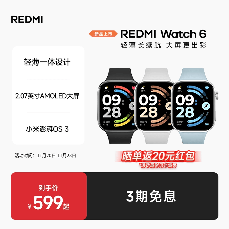 小米Xiaomi REDMI红米Watch 6智能手表蓝牙版现正限时优惠,原价699元,现参与满699减100元活动,并叠加国家补贴享8.5折再减89.85元,最终到手价仅需509.15元!这款智能手表搭载高清大屏,支持全天候健康监测,包含心率、血氧、睡眠分析等功能,同时具备多种运动模式和长久续航能力,蓝牙连接稳定,适配多种场景使用,无论是日常通勤还是户外运动都能轻松应对。高性价比智能穿戴之选,品质可靠功能全面,心动不如行动,趁优惠抓紧入手!