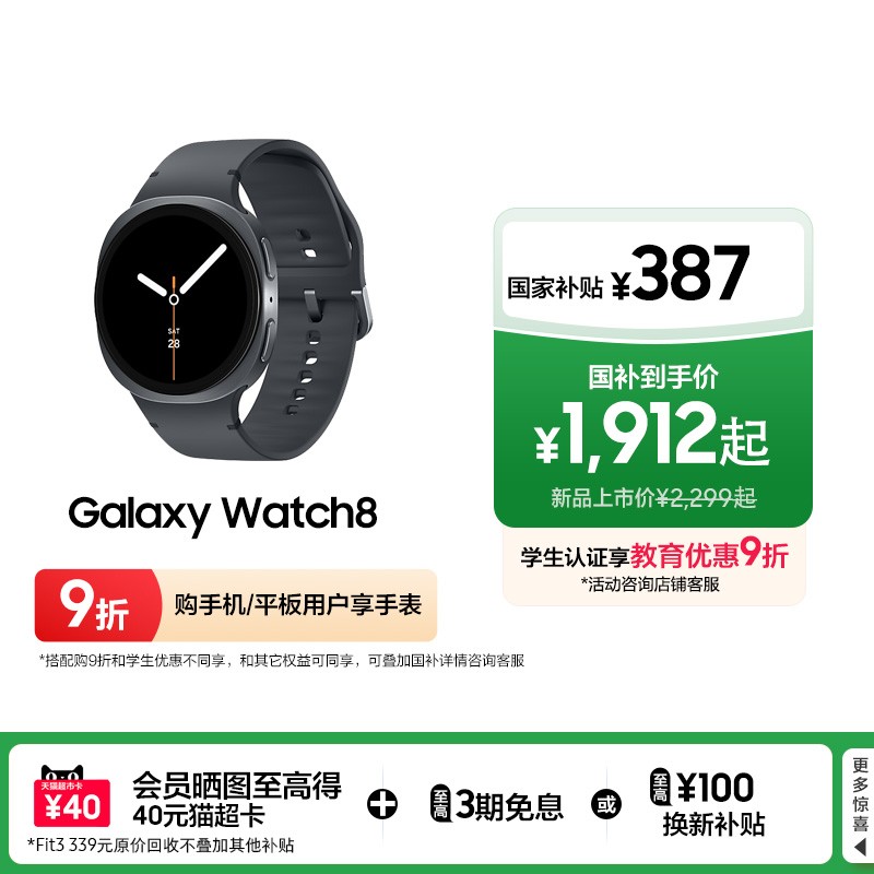 三星 SAMSUNG Galaxy Watch8 智能手表现正限时优惠,原价2299.00元,使用国家补贴立减337.05元,最终到手价仅1909.95元!这款智能手表融合前沿科技与时尚设计,支持AI运动监测,精准追踪心率、血氧、血压及睡眠质量,帮助您全面掌握身体健康状况。无论是日常通勤还是户外运动,Galaxy Watch8 都能成为您的贴心健康助手,智能提醒、消息同步、持久续航一应俱全,让您时刻保持连接与活力。品质之选,健康随行,现在入手超值划算,千万别错过!